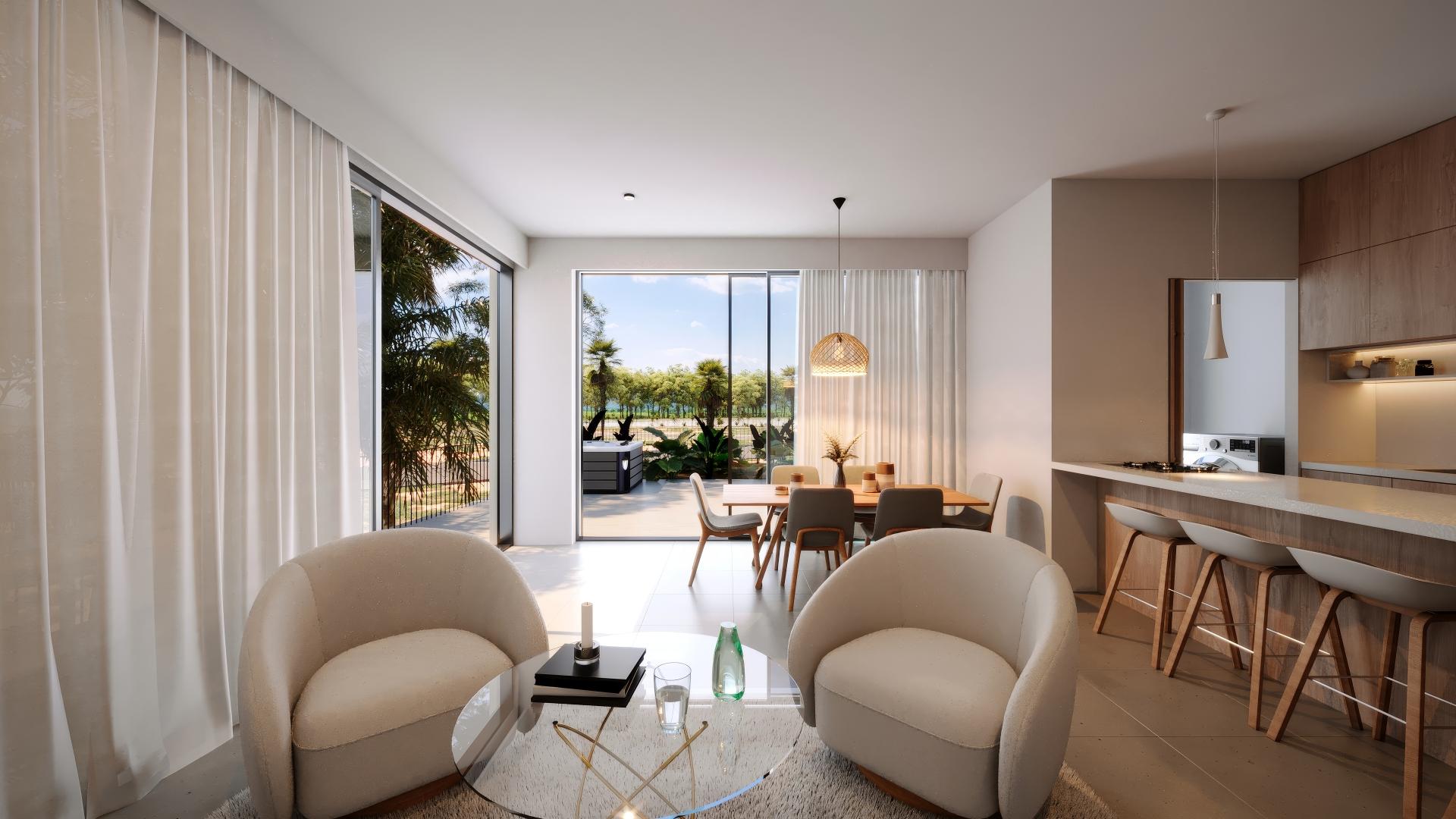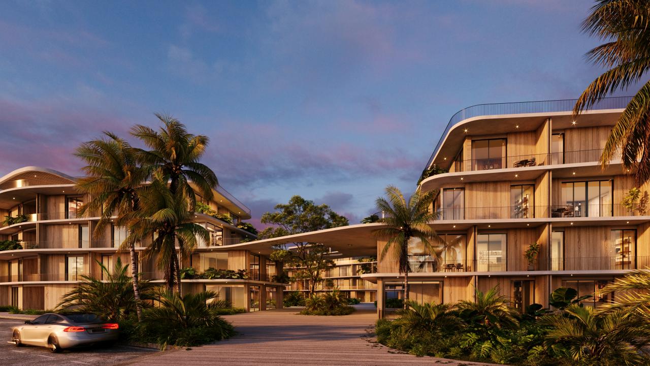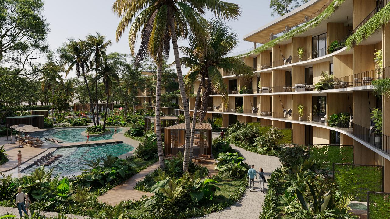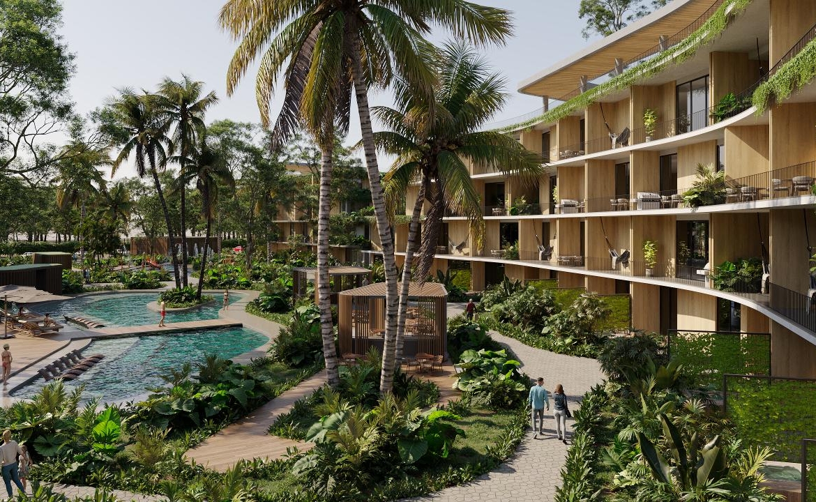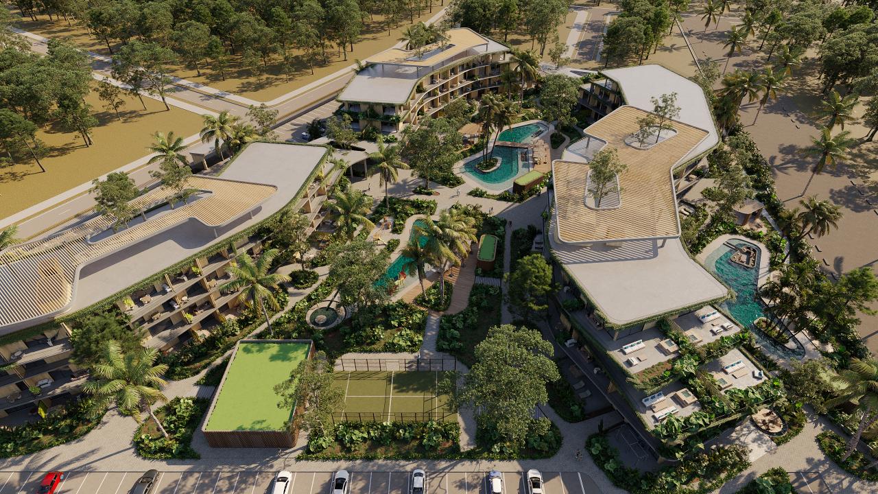 Las tipologías van desde 45 hasta 204 metros cuadrados, con configuraciones de una y dos habitaciones y penthouses con jacuzzi en terraza. Todas las unidades incluyen línea blanca y aire acondicionado. El conjunto se distribuye en tres torres de cuatro niveles con piscinas para adultos y niños, zona VIP con piscina premium, gimnasio, spa, coworking, cancha de pádel, áreas BBQ y restaurante.