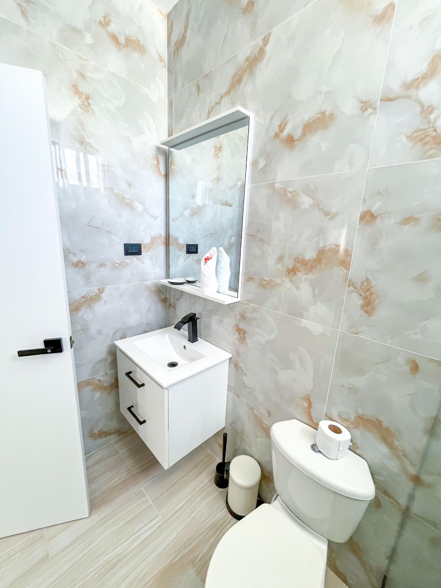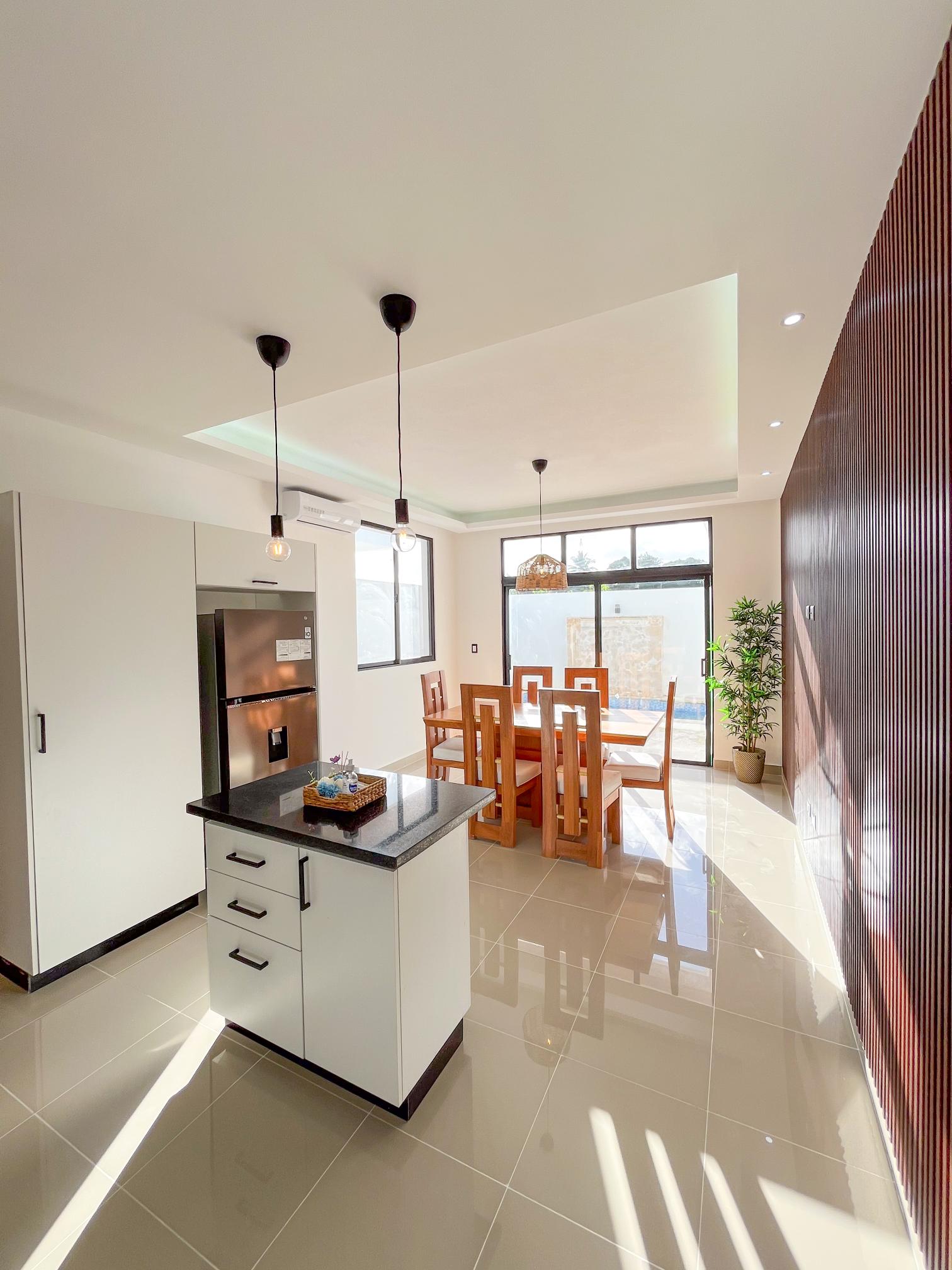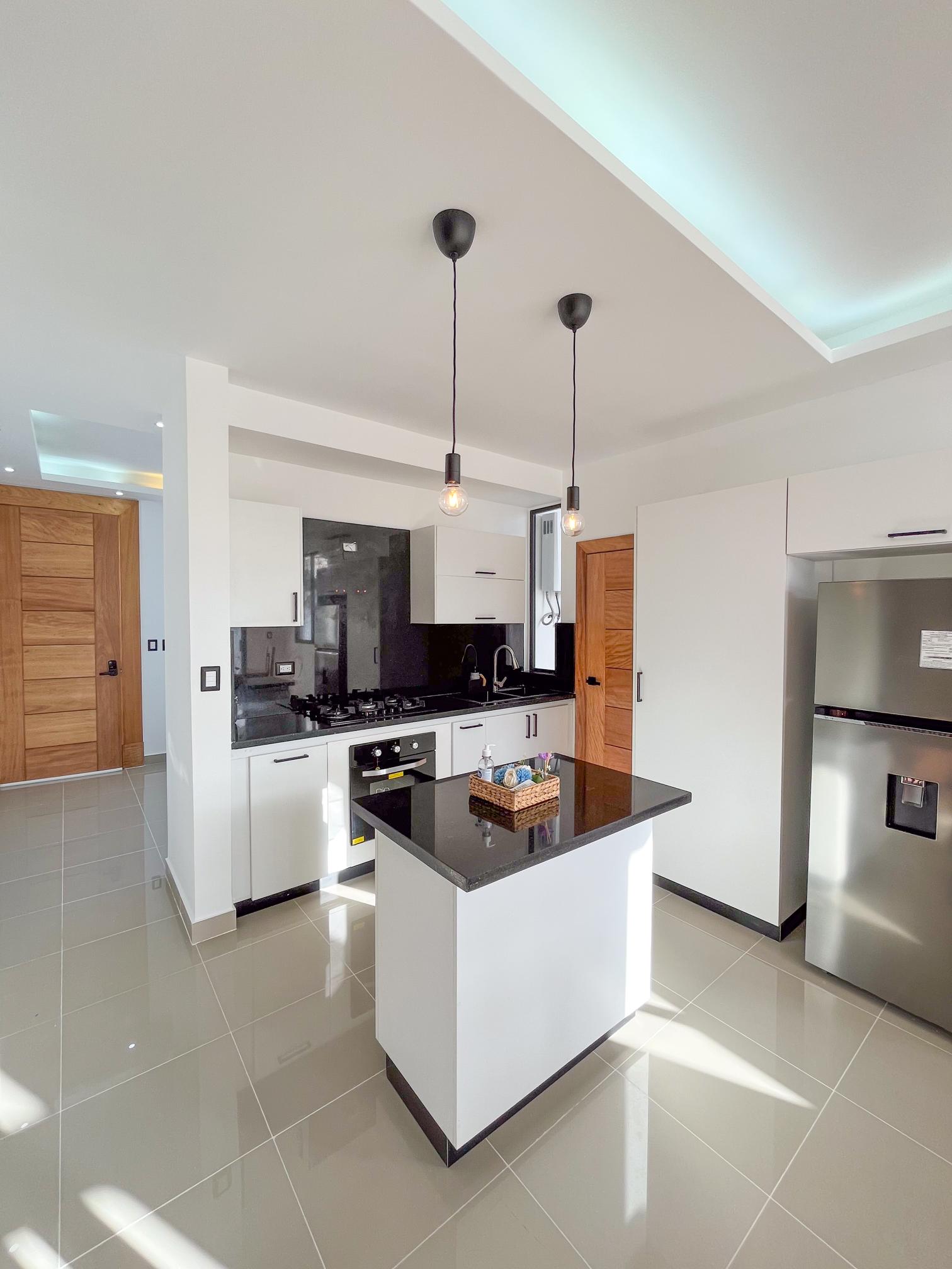 Las unidades están disponibles en dos formatos: plantas de un nivel con dos habitaciones y 84 m², y de dos niveles con tres habitaciones y 130 m². Los acabados están por encima del promedio para este segmento: topes de granito, porcelanato 60×60 en baños, puertas principales de madera sólida y línea blanca incluida con horno, estufa y extractor. Dos parqueos por unidad y posibilidad de techarlos como pergolado a costo adicional.